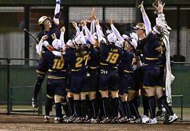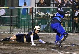![]() 佐藤選手がホームインし 歓喜するナイン |